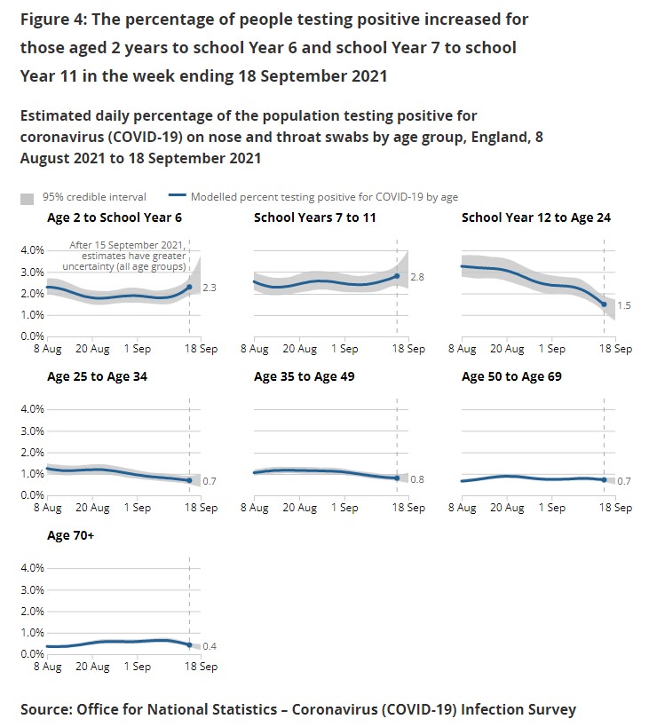 Which is curious in itself. How can the ONS seriously suggest that in the fortnight August 29th to September 11th, as schools went back, infection rates were lower in students and children? Here are the ONS’s own estimates – from the same infection survey – for different age groups. The far higher rates in those under 24 are clearly visible.