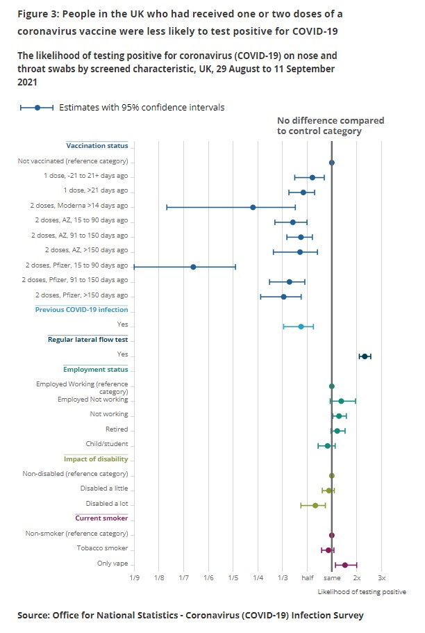 Only 6% of the study group has had a previous reported infection, yet PHE reports that around 19% of the population have antibodies from a Covid infection. Perhaps this is why the study shows that previous infection only gives 55% protection from re-infection, lower than from the vaccines even after their efficacy has waned over time and against Delta. However, this finding is based on just 59 positives in the recovered out of 10,055 tested or 0.6%, which is too small to have confidence in generalising it to the population, particularly when you take into account the chance of false positives. It also contradicts recent data from Israel which suggests that natural immunity provides much stronger protection against Delta than the vaccines.