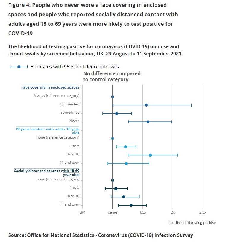 ● People who never wore a face covering in enclosed spaces were more likely to test positive for COVID-19 in the fortnight ending September 11th 2021.