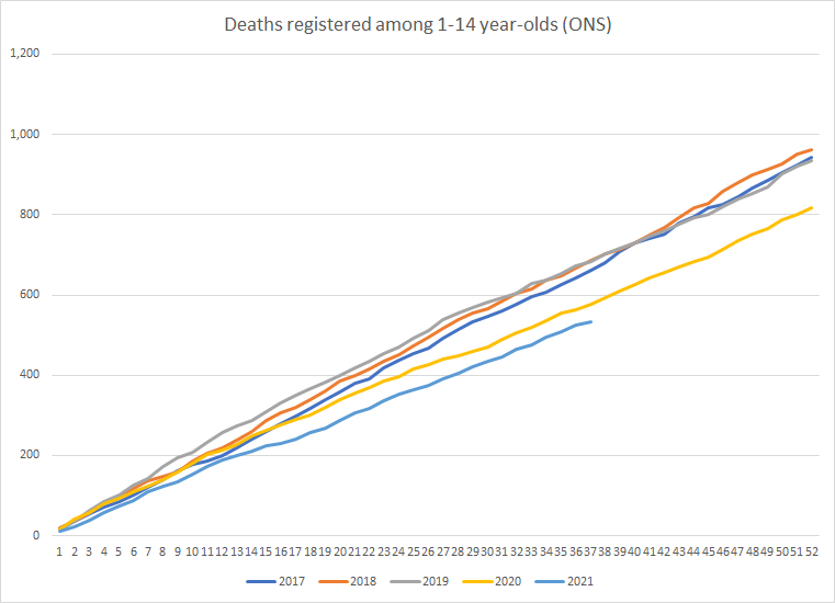 Importantly, there is no similar rise among younger children aged 1-14, as the plot below shows. Interestingly, 2020 was a low-mortality year for this age group, presumably due to fewer deaths due to road accidents and such like. 2021 has had lower mortality again, illustrating how little threat COVID-19 is to children.