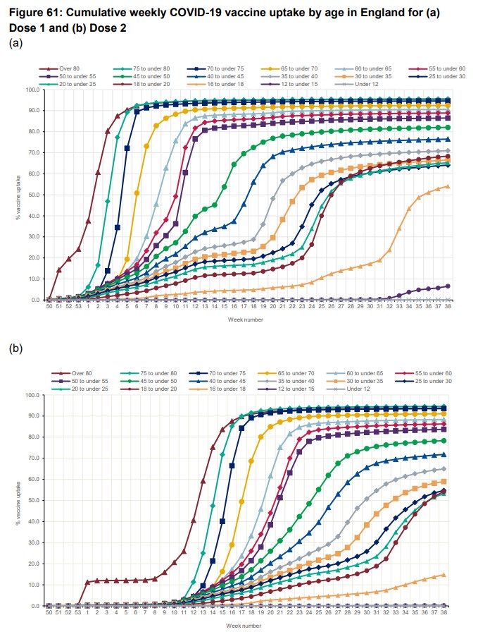 The marked divergence around week 23 broadly corresponds to when the vaccination programme among the age group was being ramped up, as indicated below.