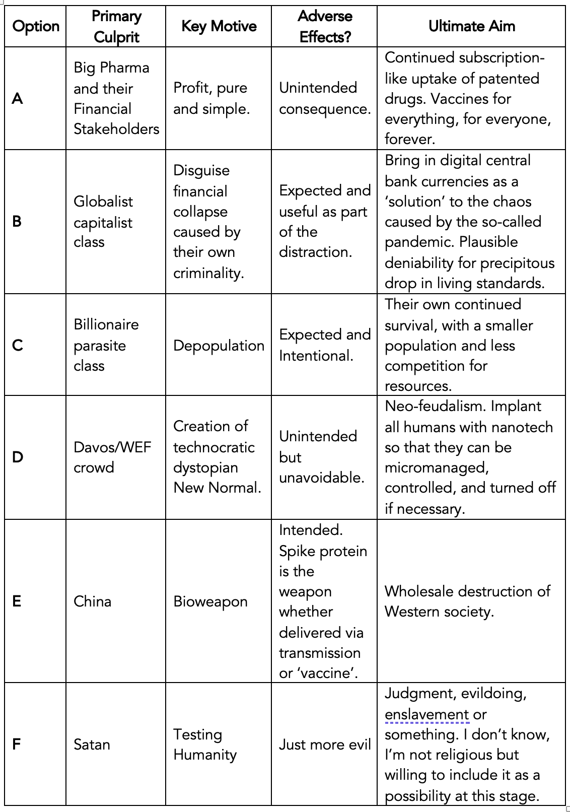A,B and D colluding is where my thinking is at the moment. (Subject to change as/when new evidence emerges.) I don’t buy into the depopulation argument for three reasons . . .