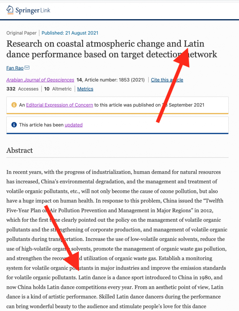 The publisher Springer Nature has released an “expression of concern” for more than four hundred papers they published in the Arabian Journal of Geosciences. All these papers supposedly passed through both peer review and editorial control, yet no expertise in geoscience is required to notice the problem: