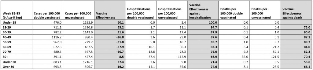 As before, the data is just for a four-week period, which, given that the early part of the Delta surge was dominated by the unvaccinated and the latter part has seen infections rise in the vaccinated, seems to me a mistake. A fairer view would cover the whole Delta surge (as with the estimates I make from the data in the Technical Briefings), but in any case the report gives a snapshot of current relative infection rates.