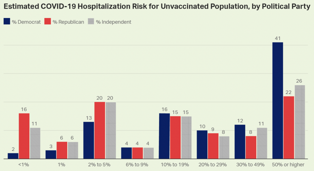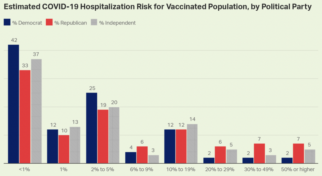 Once again, 41% of Democrats (and 22% of Republicans) said that the risk of hospitalisation for those who aren’t vaccinated is at least 50%. The correct answer is less than 5%, so these respondents were off by a factor of more than 10. Only 42% of Republicans – and just 18% of Democrats – were in the right ball-park.
