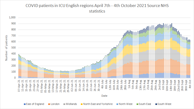 Current daily hospital admissions have stabilised around 600, but ICU admissions continue to decline (see below). Still no sign of the much ballyhooed “surge” after schools reopened.