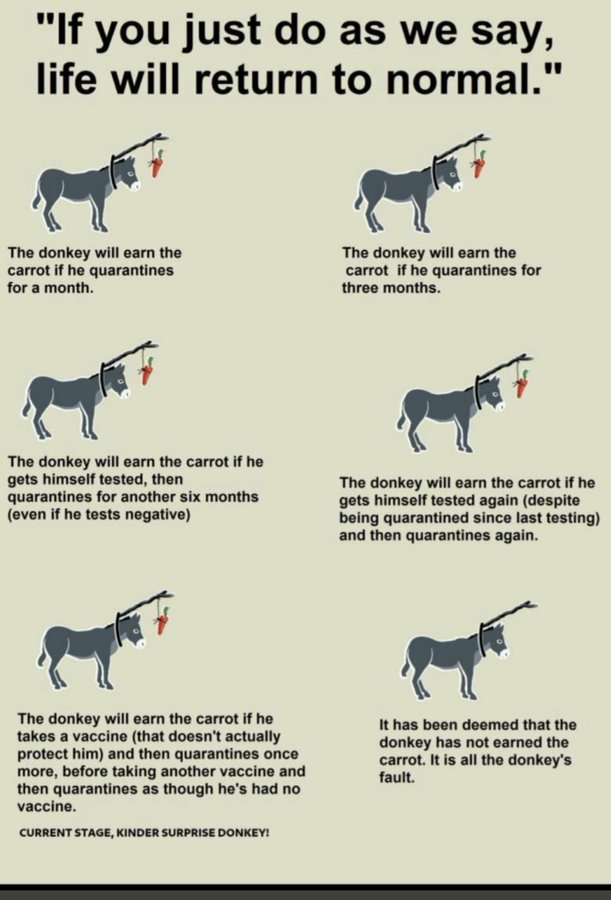 I spent some time pointing out some home truths to some relatives today – all who completely espouse the masks, testing, vaccines – and scored some hits – I could literally see them realising they might have been had. For the first time someone was running the massive fraud past them and the penny might have begun to drop. One relly was a bit discombobulated when I pointed out that the next state medical intervention might be to force them to “donate” a kidney – if you start with a jab where does it stop?