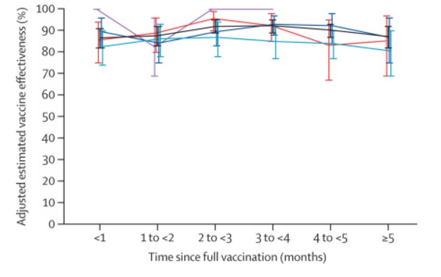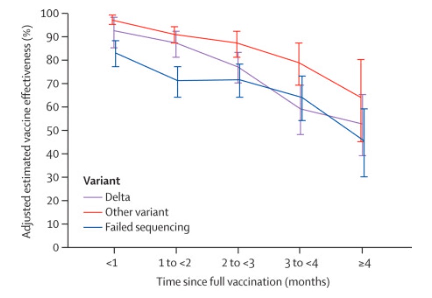The authors say their study indicates that the decline in vaccine effectiveness is primarily a function of time rather than variant-related. However, the evidence from England would suggest otherwise, as in the same period of time, but later in the Delta surge, the decline has been far greater.
