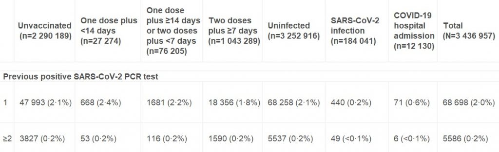 One question that’s arisen recently is to what extent vaccine effectiveness estimates are affected by whether more people who have been previously infected decide not to be vaccinated. According to this study the answer is: not very much at all. Among the unvaccinated, 2.3% had one or more previous positive PCR tests, only slightly more than the 2% of the double-vaccinated who did.