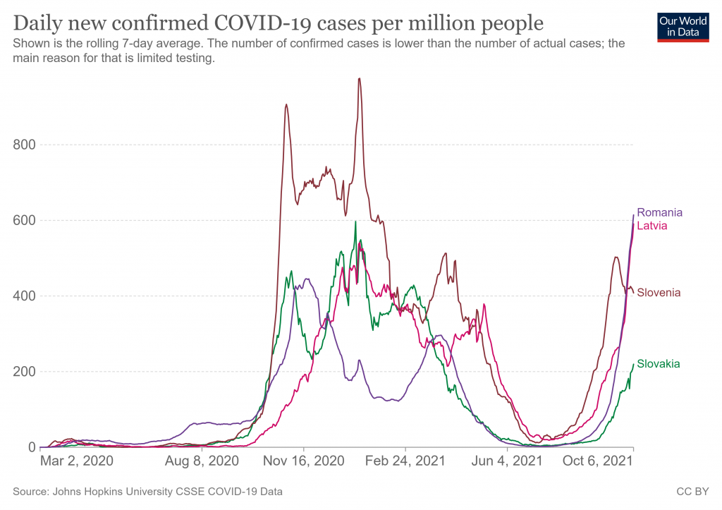 Latvia is currently on the up-slope, as predicted, while Slovenia peaked on September 18th, a little early but close enough. Slovakia and Romania haven’t yet peaked but presumably will soon;