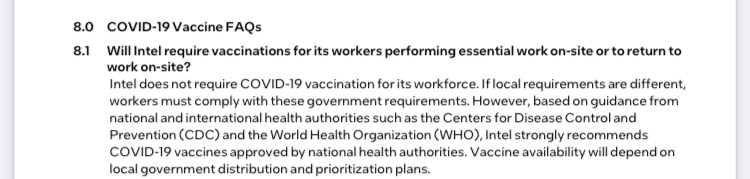 Not only that, Intel FORBIDS managers from asking for vaccination status. (Policy 8.13)