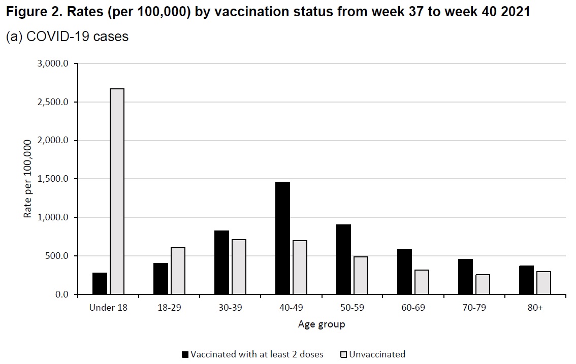 Using that definition, and their own data reported today, for those in their forties, case rates are now more than double in the vaccinated compared to the unvaccinated .