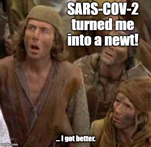Now, I’m the one laughing off the consequences of a 0.3% (with-not-from, at most, and falling) mortality disease, while those who never used to believe in no-see-ums have become the most fervent Branch Covidians, wearing muzzles at their desks even when not required.