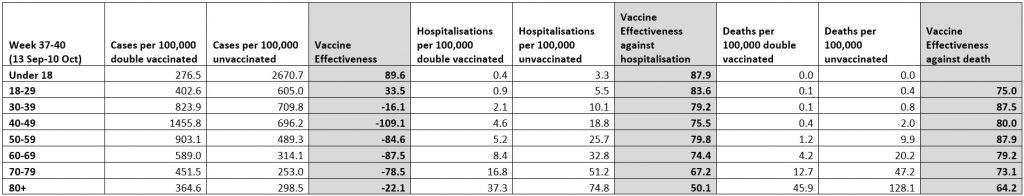 In the latest Vaccine Surveillance report from Public Health England (PHE) the infection rate in double-vaccinated people in their 40s went above 100% higher than in the unvaccinated for the first time, reaching 109%. This translates to an unadjusted vaccine effectiveness of minus-109%.