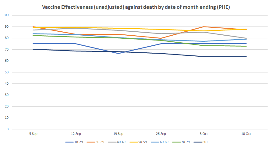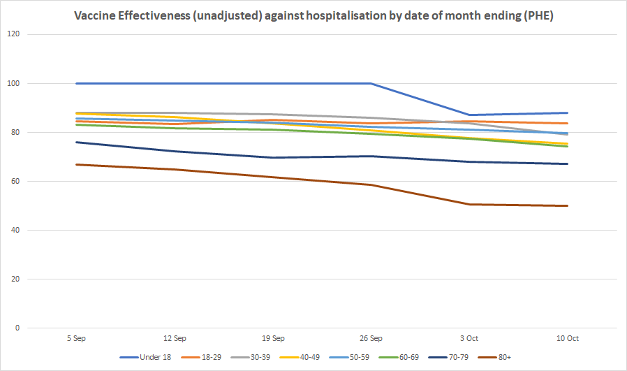 Vaccine effectiveness continues to drop fast in all over-18s (see chart at top), hitting minus-85% for those in their 50s, minus-88% for those in their 60s and minus-79% for those in their 70s. (For definitions and discussion of limitations see here.)