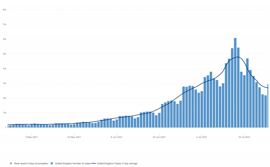 It was also a period in which infections occurred largely in the unvaccinated (for reasons that remain somewhat unclear), pre-dating the surge in infections in the vaccinated that occurred from the second half of July.