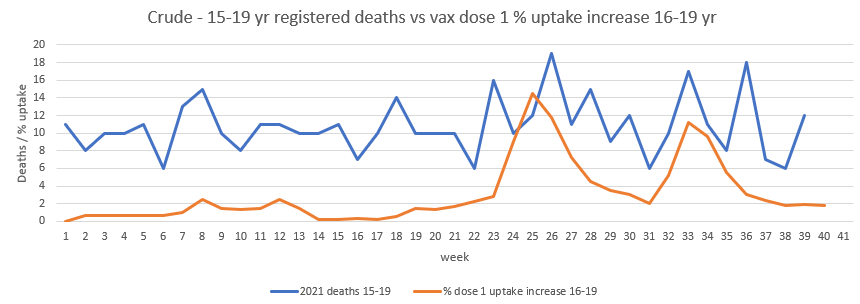 ONS data shows that there has been a 47% rise in all cause deaths amongst teenagers aged 15-19 since vaccination of this age group commenced, compared with the same period in 2020, the rise also coinciding precisely with the start of vaccination. The rise in deaths for teenage boys is 63%.
