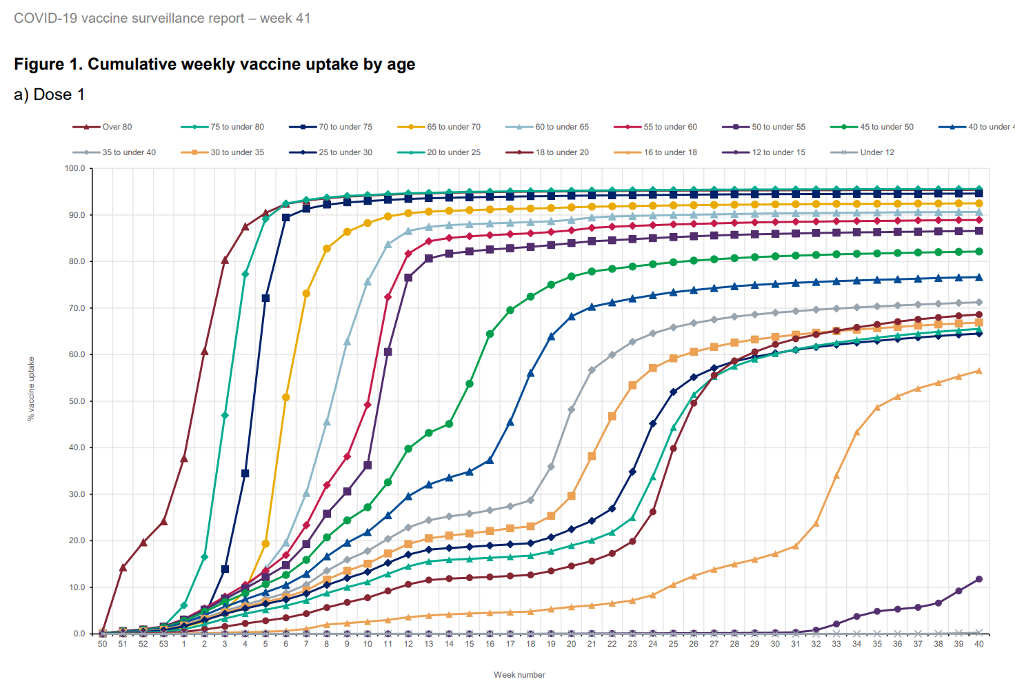 The UK’s weekly surveillance report gives the % uptake for different age bands. This is from week 41.