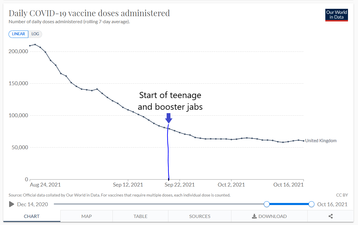 If this chart is any guide, the teenager vaccines and the boosters for the “most vulnerable” haven’t resulted in a dramatic rise in the number of daily vaccinations…