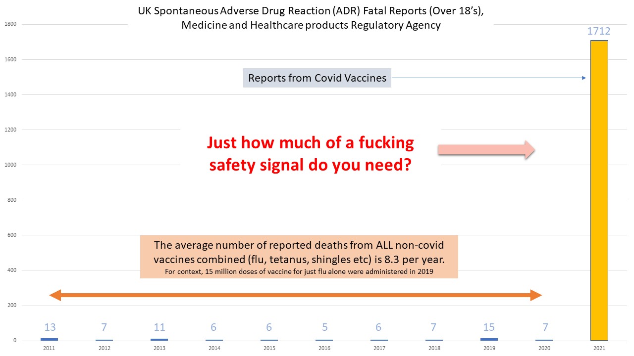 So let us recap. You can catch a coronavirus with an IFR the same as flu, which has so far killed 876 healthy people under 60 in England across the entire pandemic, or you can get an experimental gene therapy which has been banned by several countries, has killed thousands of people and given vast numbers of people strokes, clots, tremors and dangerous heart conditions, and has no medium to long-term safety data, and which will bring your absolute risk of severe disease and death down by 0.8%.