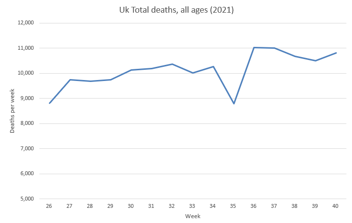 And the latest ONS death data (released Oct 19th 2021) shows a gradual rise over last few months? and the small drop from last 2 weeks now reversing in week 40?