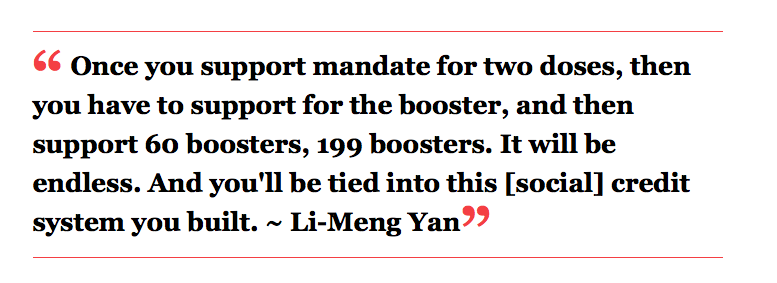 The COVID shots and the vaccine passports fit into the CCP agenda by making the whole world accept and adopt the CCP’s social control system Vaccine Passports Will Usher in a Social Credit System Of course, the COVID shots and the vaccine passports also fit into the CCP agenda by making the whole world accept and adopt the CCP’s social control system. The vaccine passports are clearly designed to usher in a social credit system like they have in China. And with that, you get 24/7 digital surveillance and an unbelievable amount of control over every single person.As explained by Yan, in China, the digital surveillance system is so advanced, if your phone GPS shows you were near an infected person, you are automatically ordered into isolation.What’s more, if parents or grandparents fail to get the COVID shot, the family’s children are barred from school, even if they got the shot. Every aspect of life is linked together through this system, so a poor social credit score will also have financial ramifications, and will dictate if, where and how you’re allowed to travel.Yan points out that Americans, being unaware of the Chinese surveillance system, don’t understand that by agreeing with… Read more »