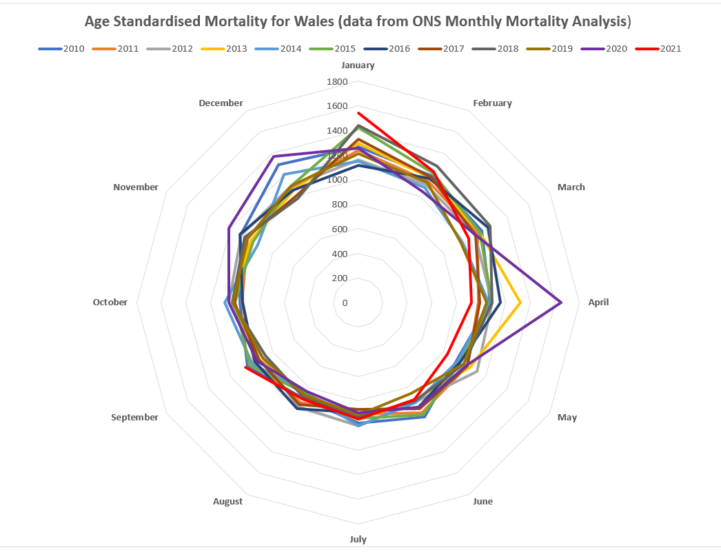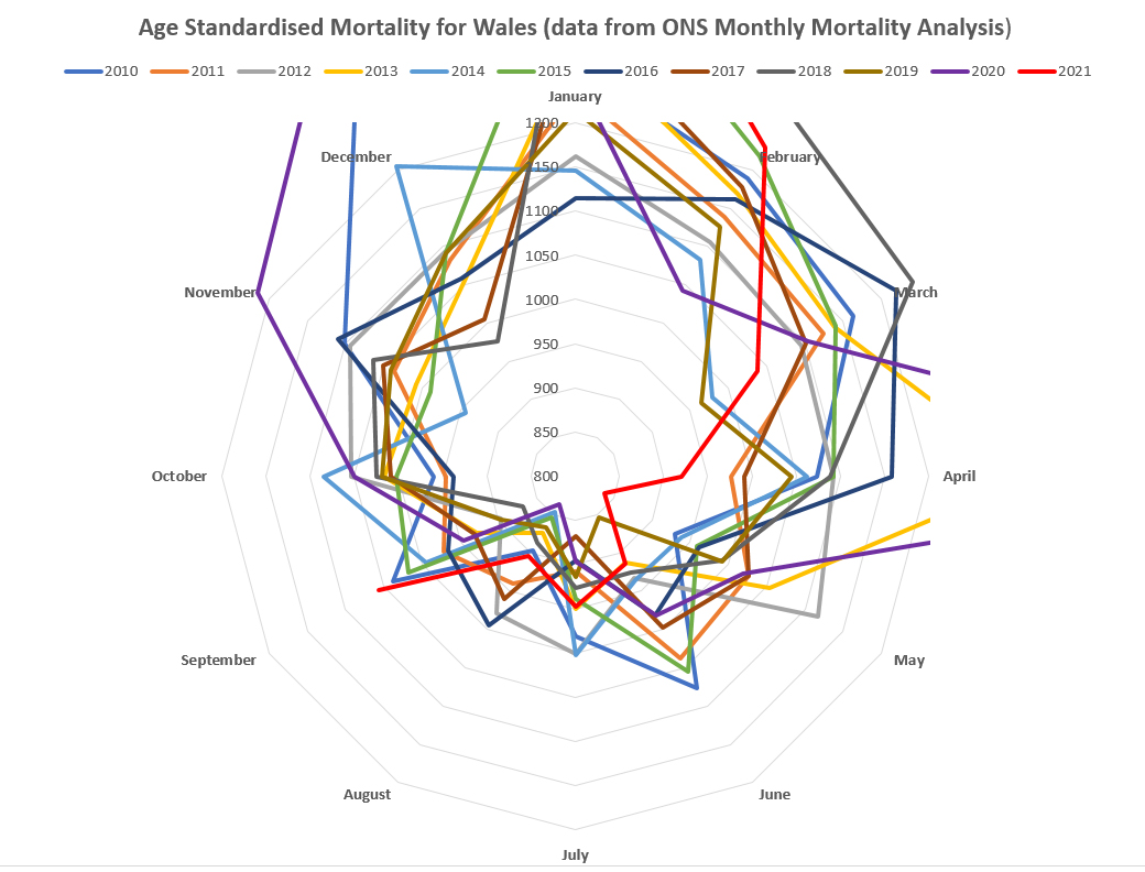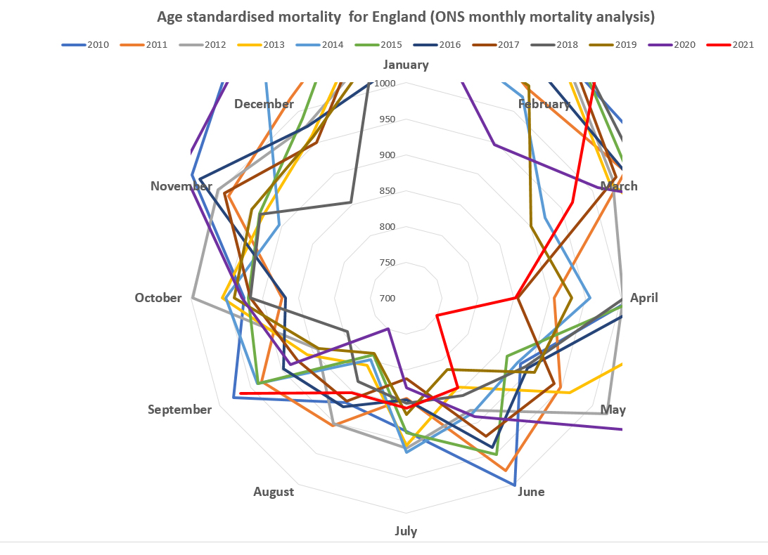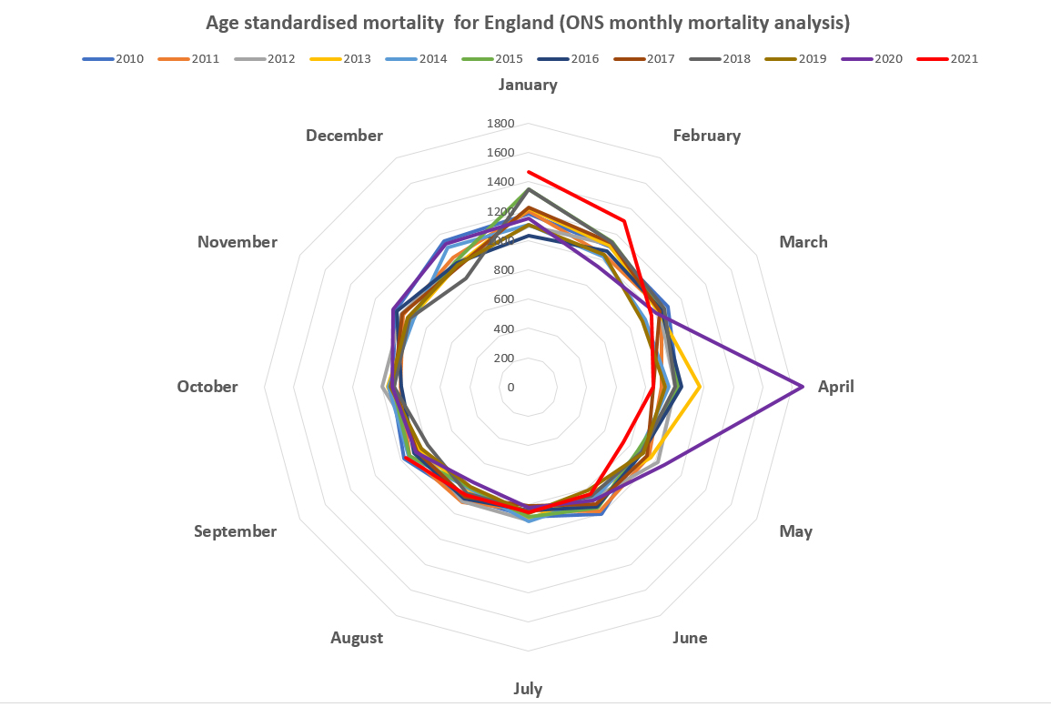 Here are the age standardised mortality figures for England since 2021 plotted on a Florence Nightingale chart.