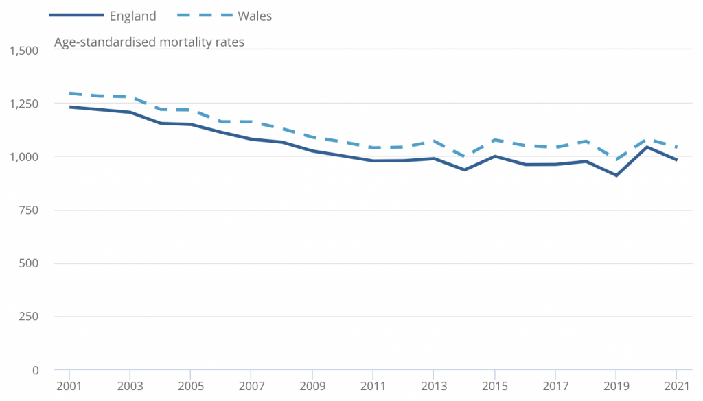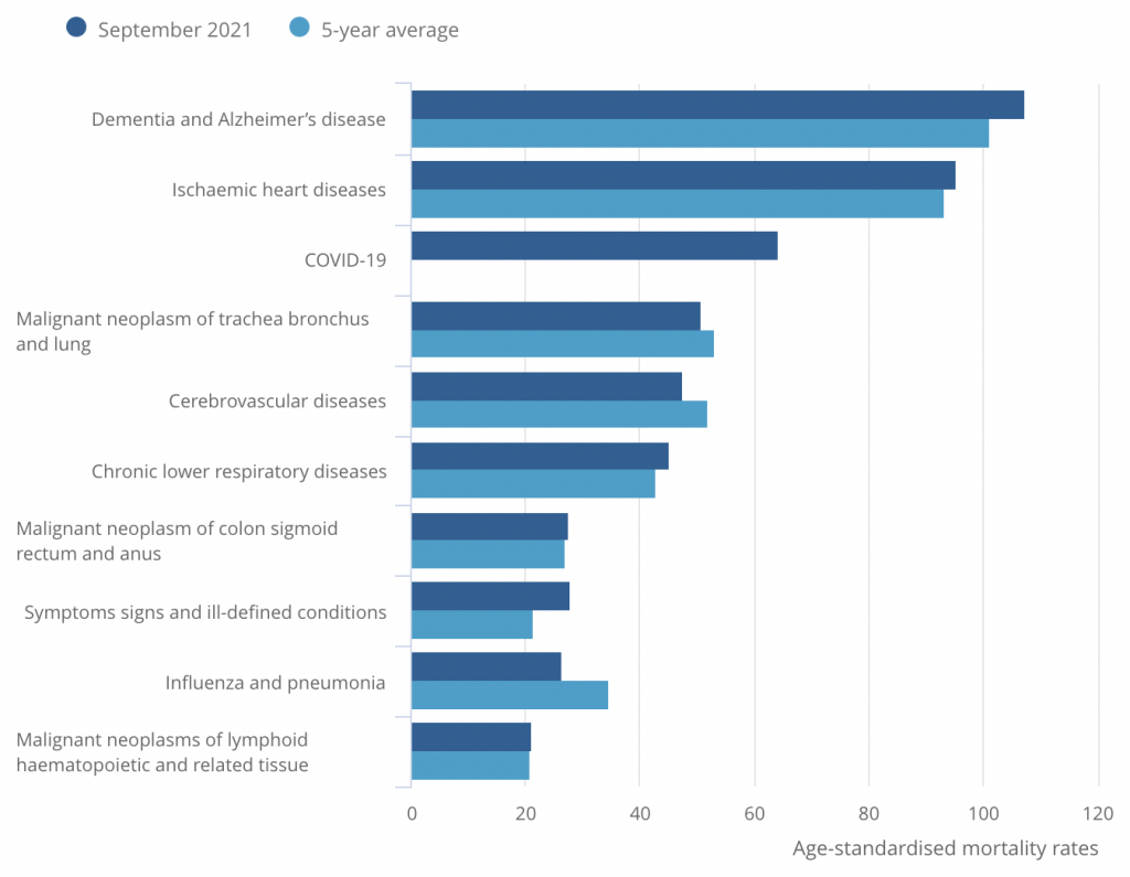 Notably, the age-standardised rates of death from dementia and Alzheimer’s, and from ischemic heart disease, were both above their five-year averages. Given that these are not respiratory conditions, the disparities are unlikely to be due to misattribution of deaths that were really caused by Covid.
