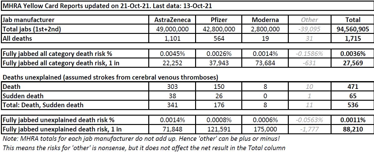 On this very simple comparison, one would not be able to draw many conclusions as to the relative failings of each. The bottom line is, of course, that nearly one third of all deaths need an explanation. And it is reasonable to assume they are strokes from micro-clotting. The onus is on MHRA to prove otherwise.
