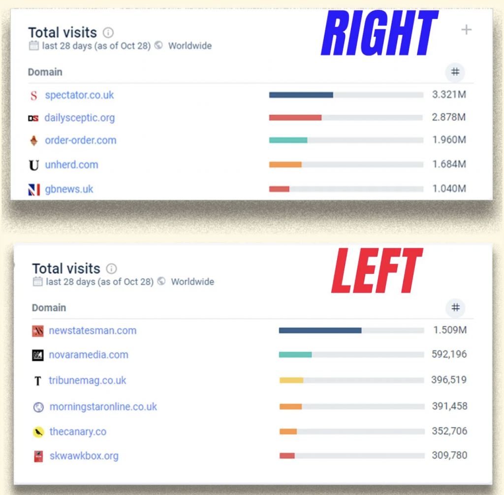 An article in this weekโs New Statesman (โIn the Post-Corbyn World, What Next for Alternative Left Media?โ) spurred Guido to do some research into their traffic and how they are performing generally. The short answer is not very well in terms of raw audience size. In comparison to right-of-centre political news and opinion sites they are well behind. Like for like The Spectator has double the New Statesmanโs readership. To give you an idea how much worse they are faring after the Corbyn-era glory days, consider this, Toby Youngโs Daily Sceptic last month alone had more online readers than the New Statesman, Novara Media and Morning Star combined!