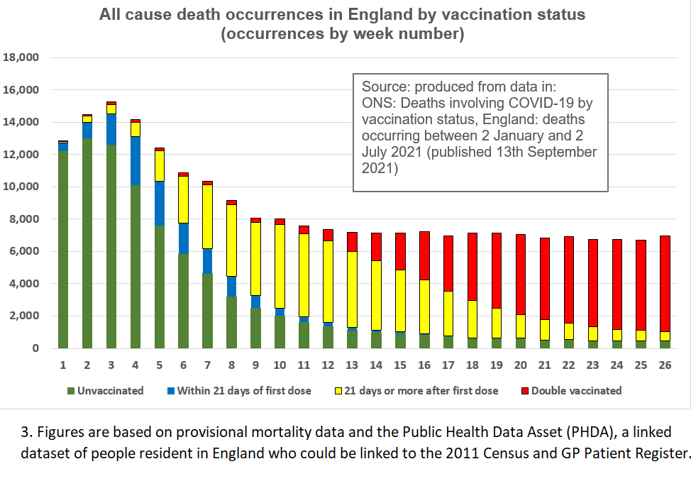 Here’s a chart from ONS data showing that in the middle of the year (week 26), how few all cause deaths were in the unvaccinated. It’s the little green bit on the right of the chart. Would be interesting to see the up to date chart.