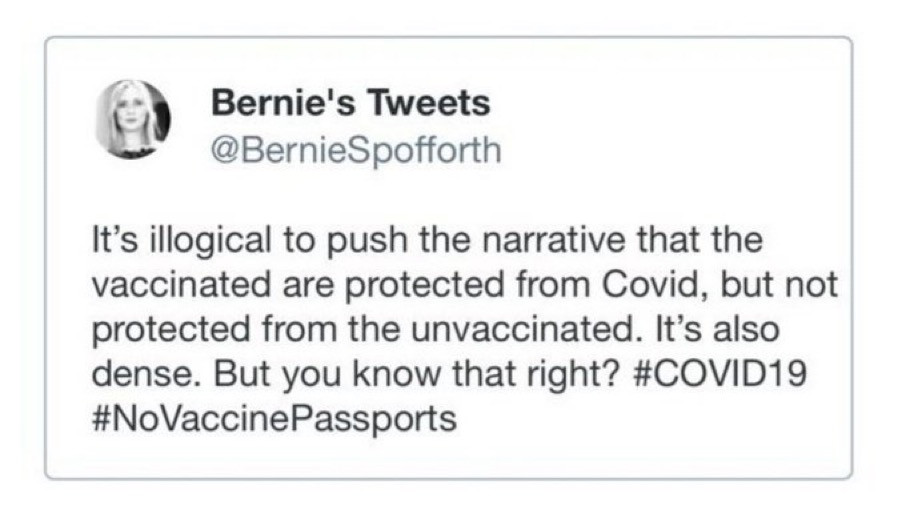 This comment was enough to get Bernie Spofforth banned from Twitter. Logic is being sidelined for dogma. The powers that be no longer have a valid reason to implement the Vaxx ID. I fear they will resort to coercion..