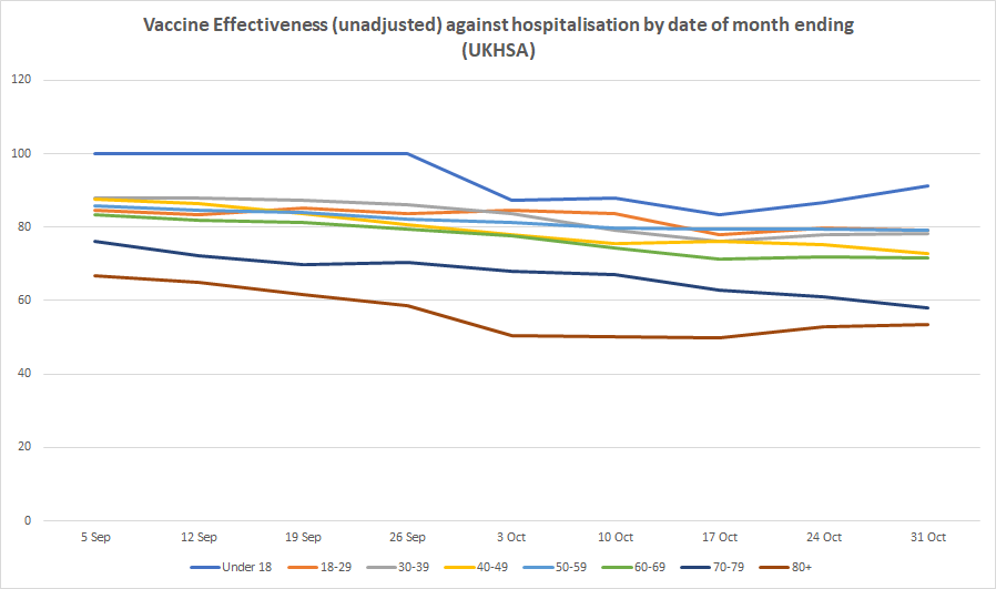 Here’s this week’s table of unadjusted vaccine effectiveness and the updated graphs showing how it is changing over time. It shows infection rates currently twice as high in the vaccinated compared to the unvaccinated for those aged 40-79, corresponding to an unadjusted vaccine effectiveness of minus-100% or more. Vaccine effectiveness is negative for all over-30s, and almost zero for those aged 18-29 (and still declining). It remains high for under-18s, and effectiveness against hospital admission and death is holding up. This week the decline appears to have stopped, or at least paused, in most age groups.