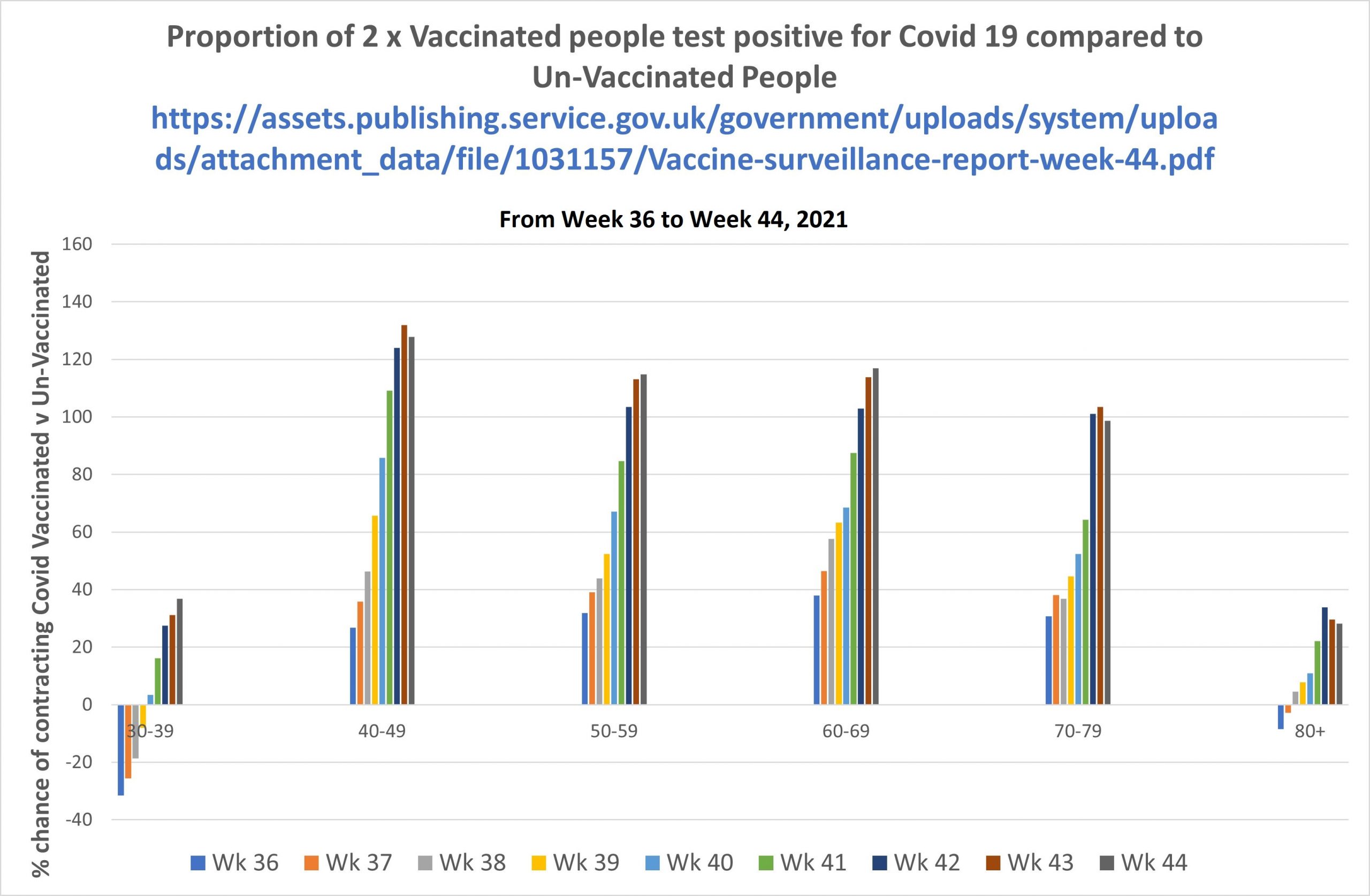 The latest report continues to say Vaccine effectiveness is estimated by comparing rates of disease in vaccinated individuals to rates in unvaccinated individuals. Since the report gives those rates broken down by age, which shows that for most adult age groups the rate in the vaccinated is much higher than in the unvaccinated, it is perfectly reasonable to compare them. The report itself does, for it declares In individuals aged greater than 30, the rate of a positive COVID-19 test is higher in vaccinated individuals compared to unvaccinated That is a comparison: the rate in one cohort is higher than the rate in another cohort. These rates give us a reasonable indication of the rate of infection in groups. If I am among a large group of vaccinated people in their 40s then more people in that group would likely test positive than if they were all unvaccinated. Or to put it another way, the more in the group who are vaccinated, the higher the rate of test positives around me there will be. It also means that if I draw a sample, including an individual, from most adult age groups then the higher the vaccination rate in the group,… Read more »