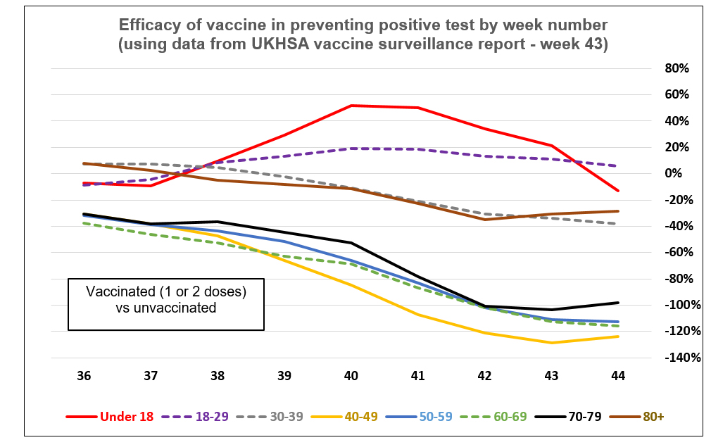 The under 18 age group is misleading as there are so few double jabbed. When you include single jabbed there’s actually negative efficacy there also according to my calculations.