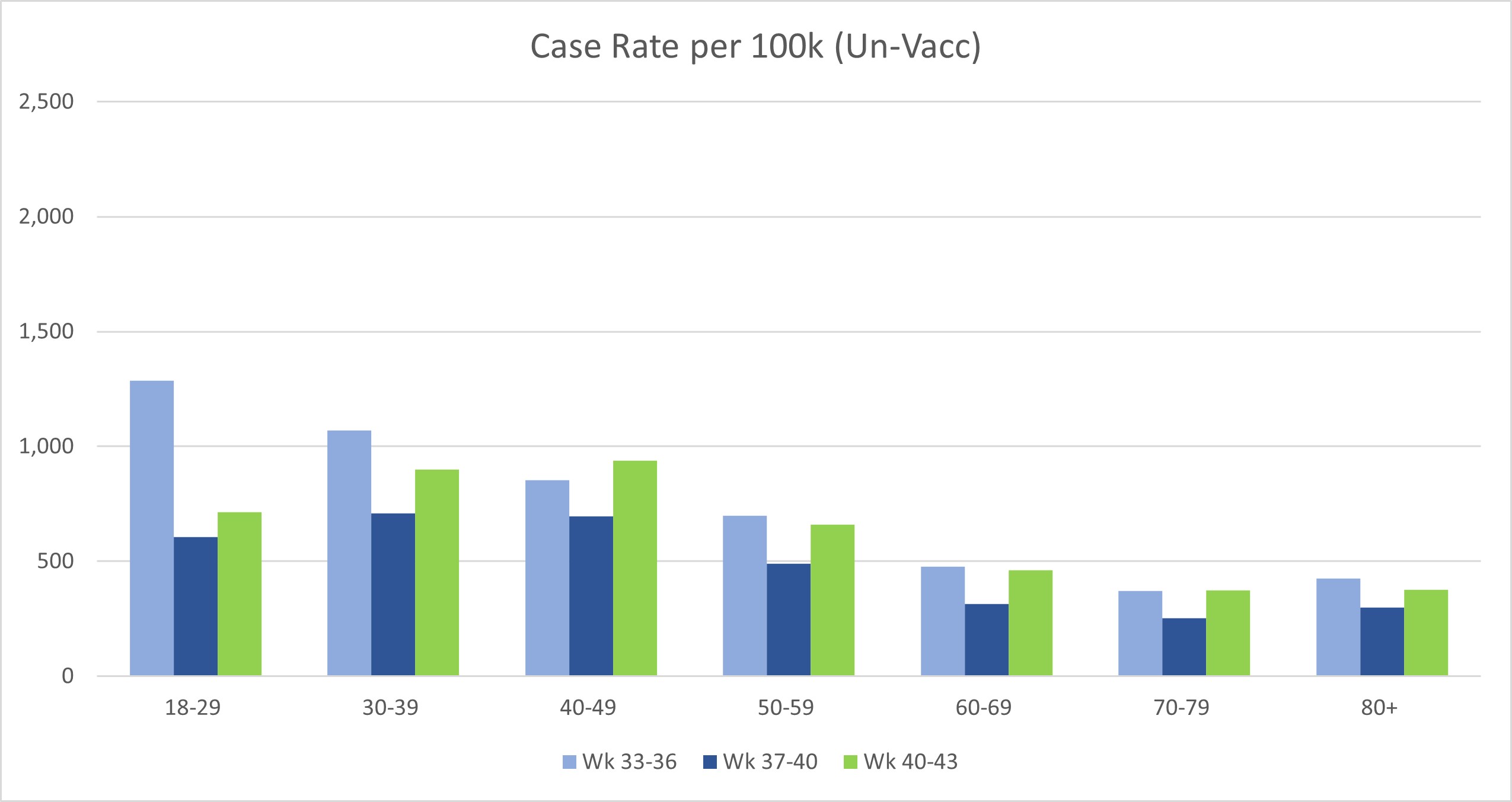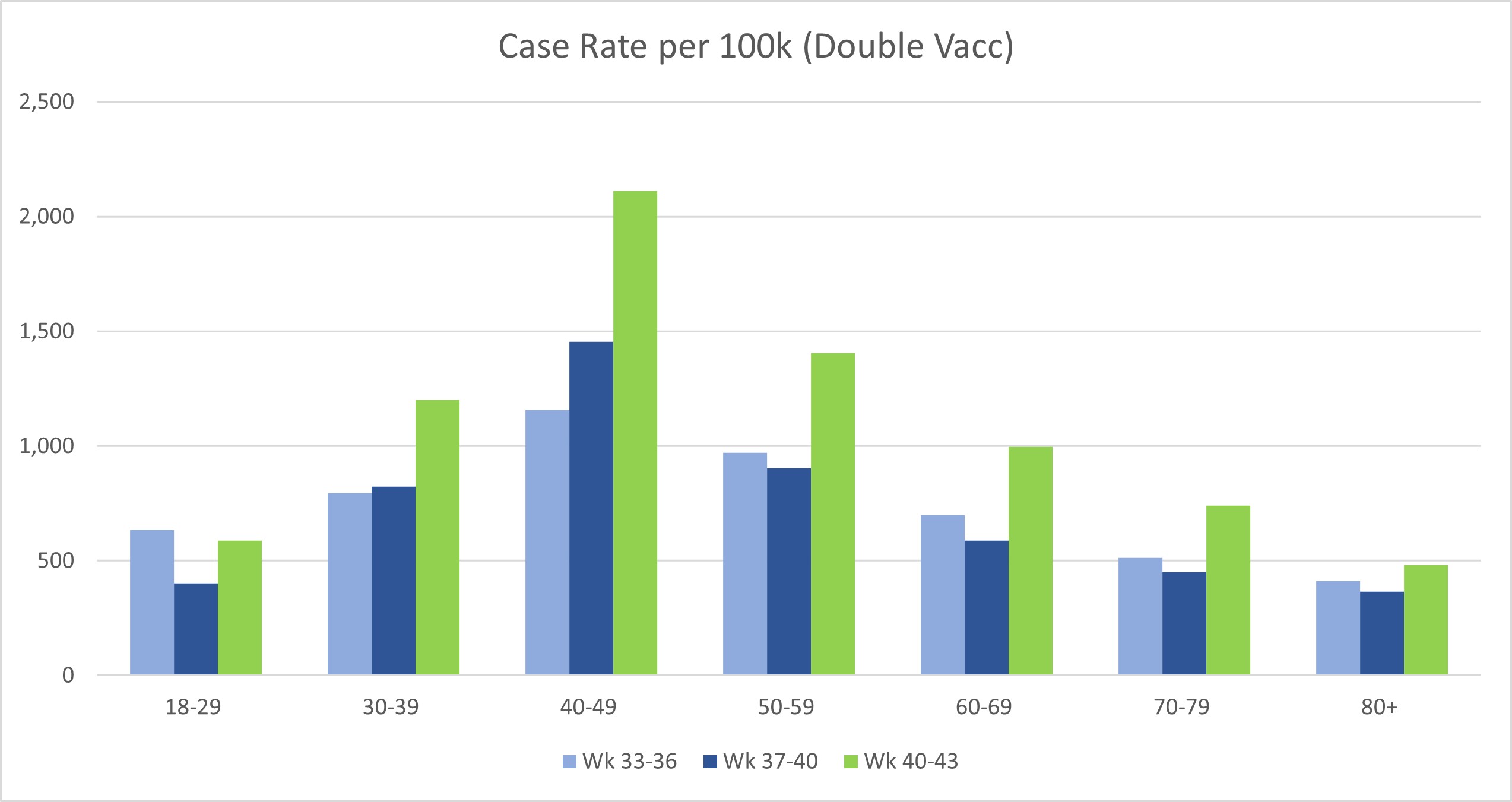 This is rolling 4 week data, so after next weeks update, we will be able to explicitly compare case rate data for 3 completely separate 4 week periods running weeks 33-36, 37-40 and 41-44 respectively.