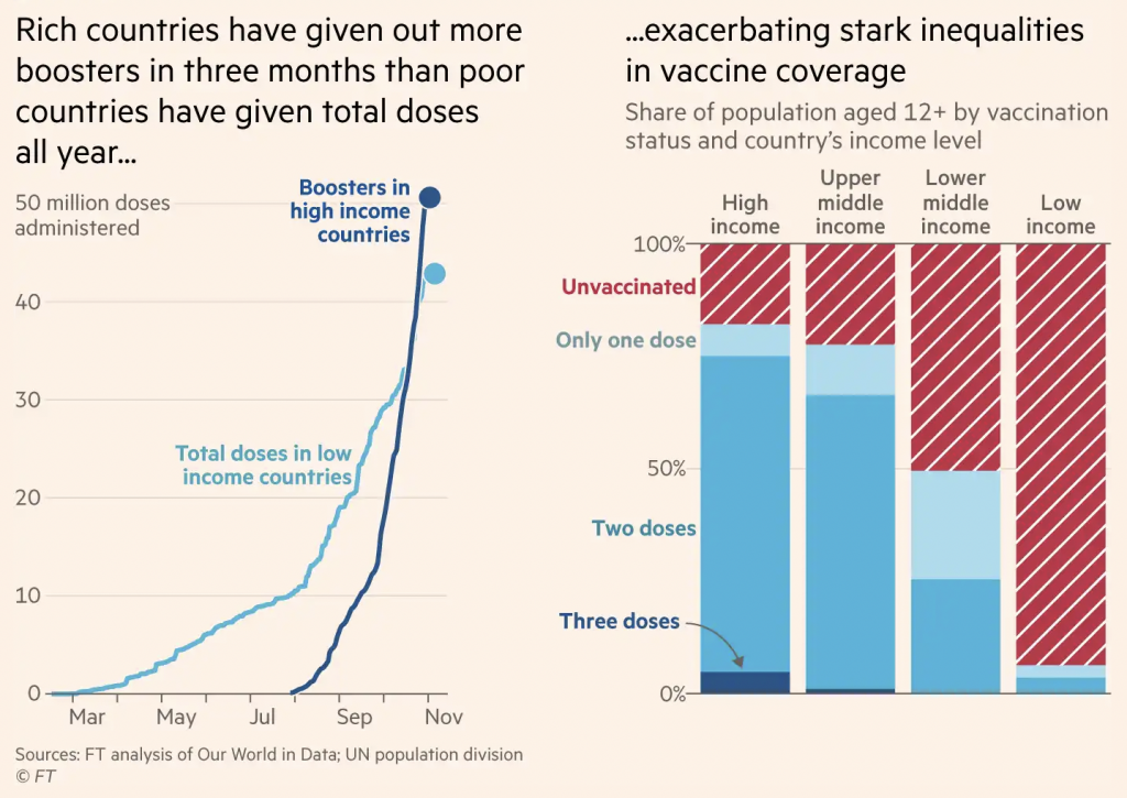 The scale of rich countries’ vaccine-hoarding is laid bare in a recent chart published by the Financial Times. It shows that rich countries have administered more booster doses in the last three months than poor countries have administered total doses since their rollouts began.