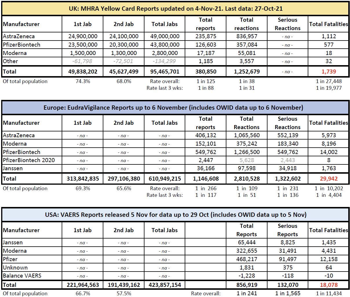 Here’s a simple summary of vaccine adverse effects from UK, Europe and USA up-to-date as of today (5th November)
