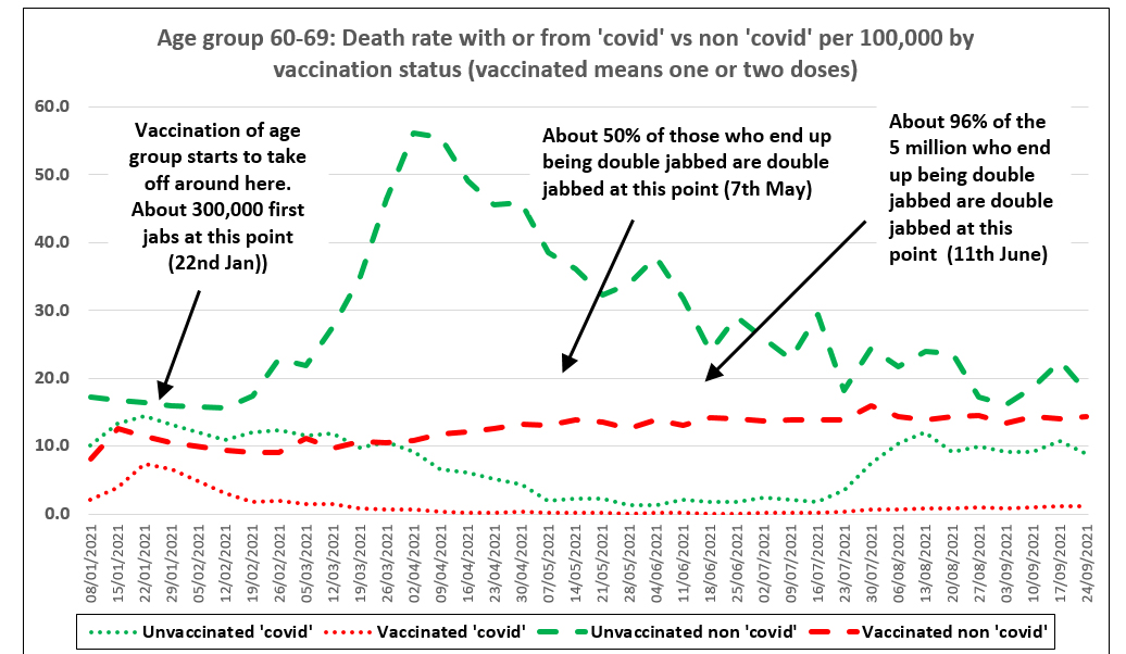 The reason the covid deaths while going down in the unvaccinated, go down slightly less quickly in the unvaccinated than the vaccinated is not because of vaccine efficacy, it is because some of these unvaccinated people are most ill (the non-covid going up tells you that) but a proportion of them get their deaths labelled as covid.