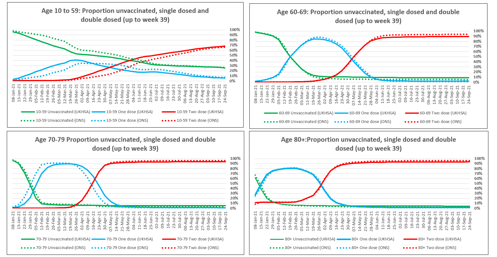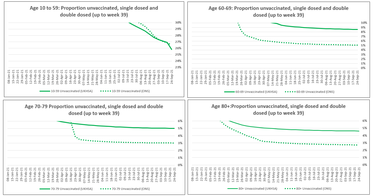 And here’s the close up showing the unvaccinated proportion is significantly different in the 60+ age groups. There is no real difference in the 10-59 age group at least when considering the age group as a whole, but there may still be dsicrepancies within that wide age band.