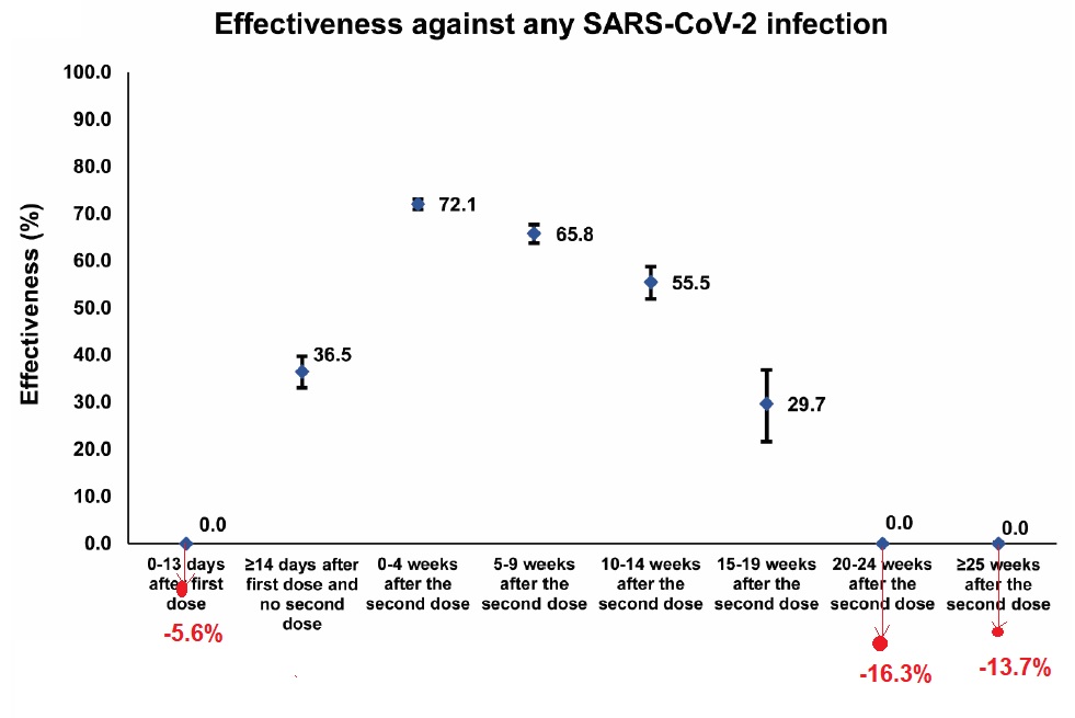 The authors don’t report a vaccine effectiveness below zero, i.e. negatives are reported as zero. However, the data enables one to calculate that actual figures. They hit -16% effectiveness after a few months.