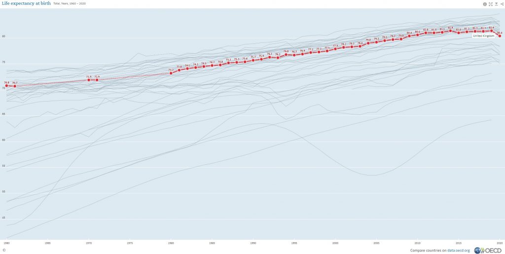 A new report from the OECD has shown that the pandemic took life expectancy in the UK in 2020 back to 2010 levels. Life expectancy at birth dropped by one year from 81.4 to 80.4, a level last seen in 2009. In 2008 it was even lower at 79.8.