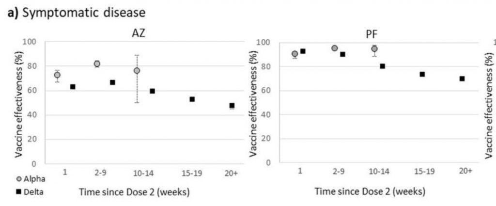 The chart below shows the estimates over time for the two main vaccines, indicating declining effectiveness.