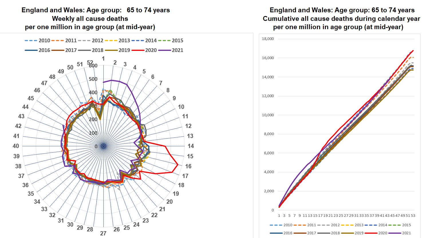 It looks bad in all adult age groups. Here is the chart for the 65-74 age group. A zoomed in version of the Florence Nightingale chart appears in the reply. Appears to be worsening in the older age groups again. Boosters?
