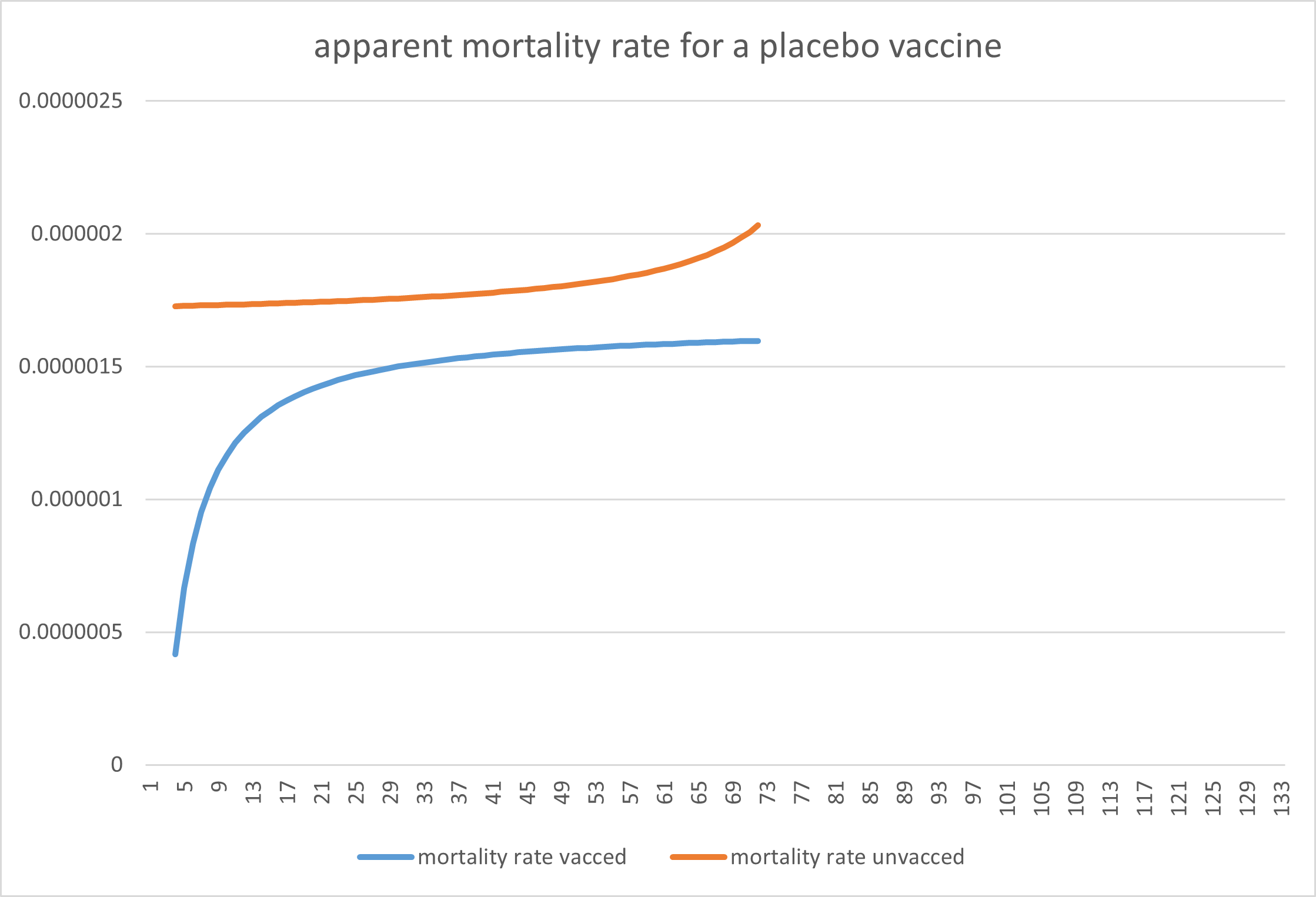 The attached shows the apparent mortality rate of a placebo vaccine where deaths today are divided by the size of the vaccine cohort today but the deaths are delayed by 4 weeks from contracting covid.