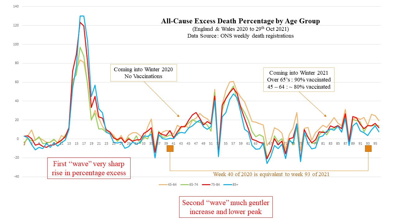 There does seem to be something strange going on in terms of excess death in the ONS data – and there’s a definite pattern. If you look at the data in terms of percentage excess the trends become quite clear. I’ve taken the usual simplistic approach to this here Time for a 2nd Round – by Rudolph Rigger – Riggery Pokery (substack.com) Of course all the usual caveats about using a 1st order estimate of excess apply (using historical 5 year mean) but we do need to attempt to understand what’s happening. I don’t think any firm conclusions about causality can be drawn. The excess might be driven by the deranged response to covid and the covidization of our heath service. Or it might be driven by vaccination adverse effects. Or a combination – or some other factors too. What I’m not seeing in the overall ONS data at least is really clear evidence of vaccine safety and efficacy. What we’ve done seems to be starting to make things worse overall. Even if the vaccines have saved some from covid – overall we’ve buggered things up. It’s like the dentist who says: good news, we’ve saved your teeth – unfortunately… Read more »