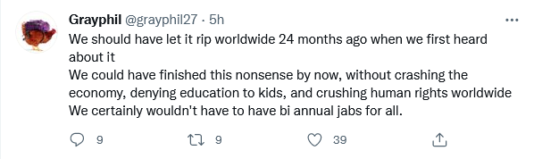 When you consider that the fatality rate for the vast majority of the population was around 0.03% it would have been much more sensible to protect the elderly and the vulnerable while allowing everyone else to continue as normal as possible allowing them to acquire natural immunity – this was always the best way to deal with this pandemic. In fact I read somewhere once from some pandemic/virus expert that the best way to deal with a pandemic is to power your way through it – all lockdowns and restrictions did was temporarily delay the inevitable – this virus was always going to have its day.