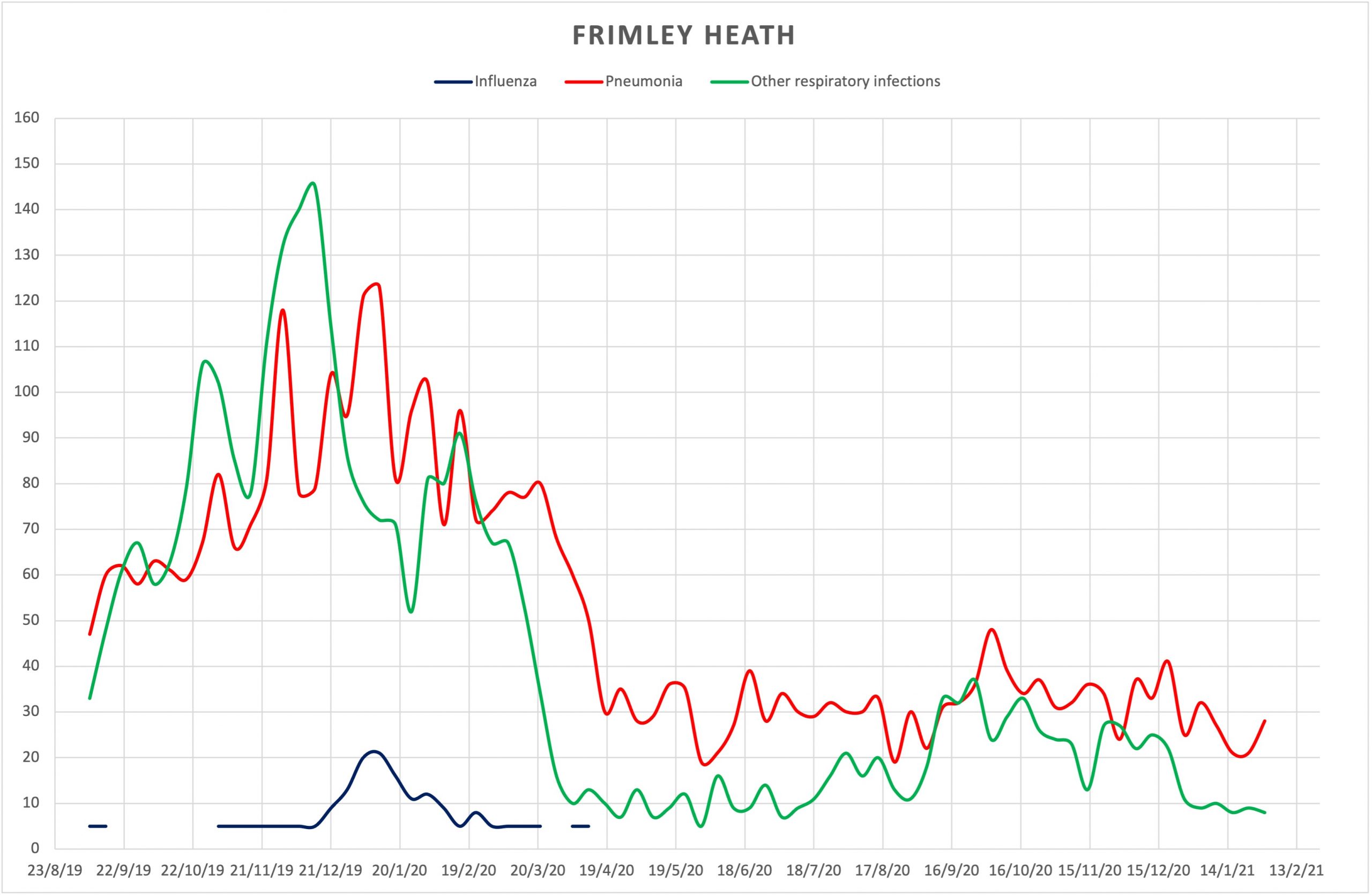 The coronavirus season tends to be mid autumn to January. The flu season tends to be December through to February. This is data for Frimley Heath trust for autumn 2019. They were kind enough to separate out the respiratory admissions into influenza, pneumonia and others. I am aware it’s two years old, it was data I obtained to see if SARS-CoV-2 was present earlier than generally acknowledged, but I think it’s still valid. It does cover the autumn period of 2020 and goes into the beginning of this year.