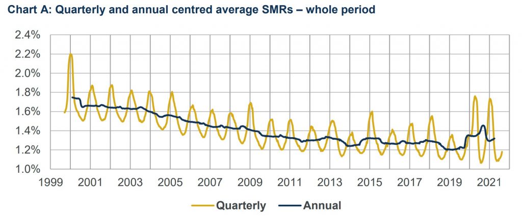 I’m slightly surprised to be writing this post as to my mind the answer is obvious – of course the U.K. will face a winter Covid surge. It’s winter. That’s what happens in winter; the dominant respiratory virus surges and, most years, taxes the capacity of the health service. The only question is how big it will be – unusually large like 2020-21, or unusually small like 2019-2020 before Covid hit? It’s worth remembering that more people died in England and Wales per head of population in 2008 (once adjusted for age etc.) and every year prior to it than died in 2020 or 2021, many of them succumbing during the winter flu season, as the chart below from the Institute and Faculty of Actuaries shows. In other words, there’s a winter surge in deaths-by-virus every year, and I see no reason why 2021-22 will be any different.