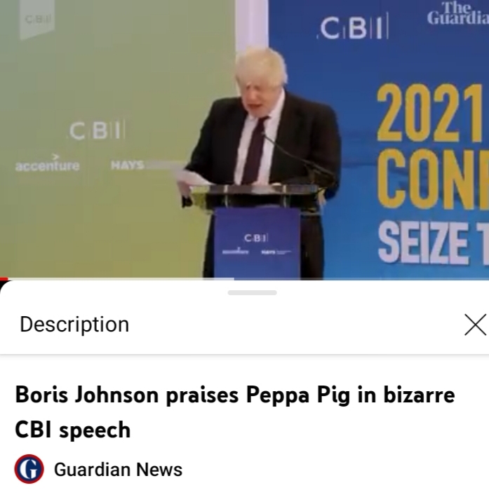 Yes, the Peppa Pig thing is a bit of a red herring. (The character does look like a Picasso version of a hairdryer – that’s quite a witty quip – and although I thought the CBI was mainly about real industry it turns out I was wrong and it also represents members in “creative” fields, so Peppa is on-topic for such an audience.) More relevant is his seeming like a confused person a decade or two older than his actual age, losing it for quite some time, and sniffing as if…as if he felt some kind of irritation in his nose, shall we say. Fat boozers aren’t thin on the ground among British politicians – a mid-50s, clinically obese, drunkard is the norm – but it’s no secret that this particular one is especially debauched, so who knows? Two more screwups like this would be enough to finish his stint in Number 10 – possibly even one in the right context, such as for example saying something truly egregiously ignorant or joky or confused about SARSCoV2 or pandemic policy or an operationally serious foreign policy matter such as Channel fishing, the Polish-Belarusian border, or hey, why not an issue he’s… Read more »
